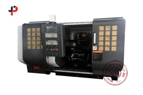 Машина имеет полностью электрическую регулировку давления; электрогидравлическое позиционирование задней бабки; автоматическую защитную дверь; устройство смены инструмента «4+4»; полый центрирующий узел; полую поддержку резервного копирования; выталкиватель деталей; автоматическую систему смазки заготовок; и др.